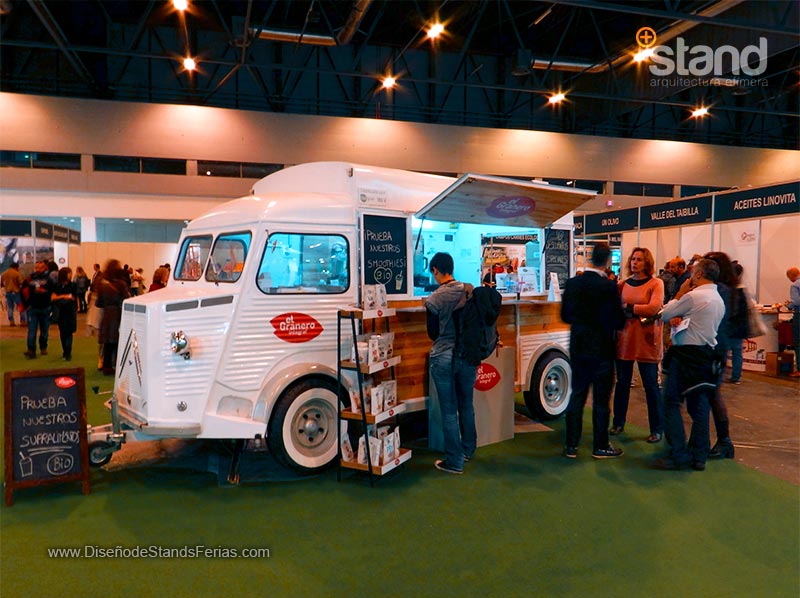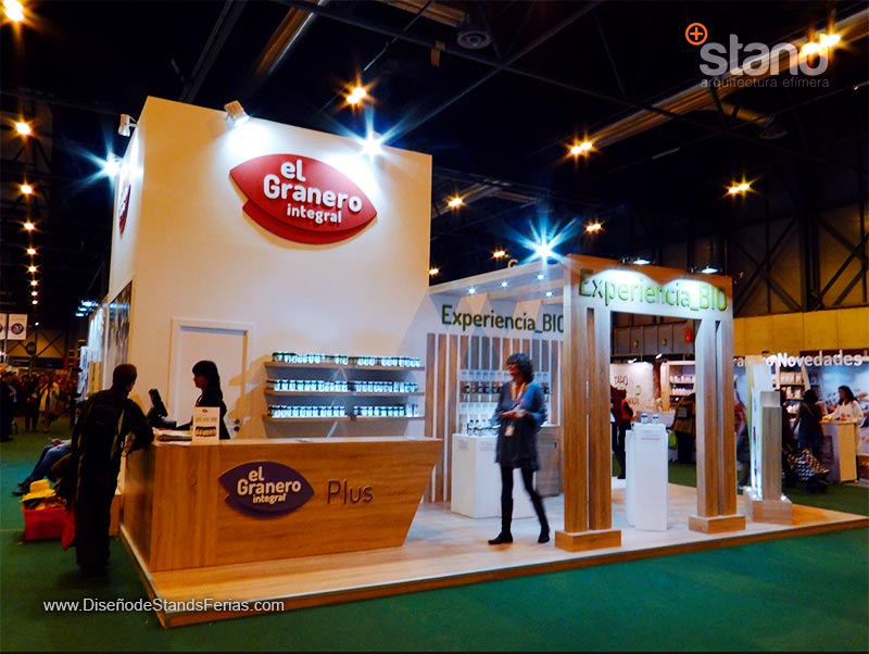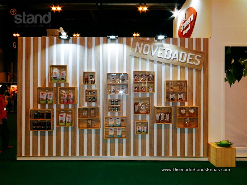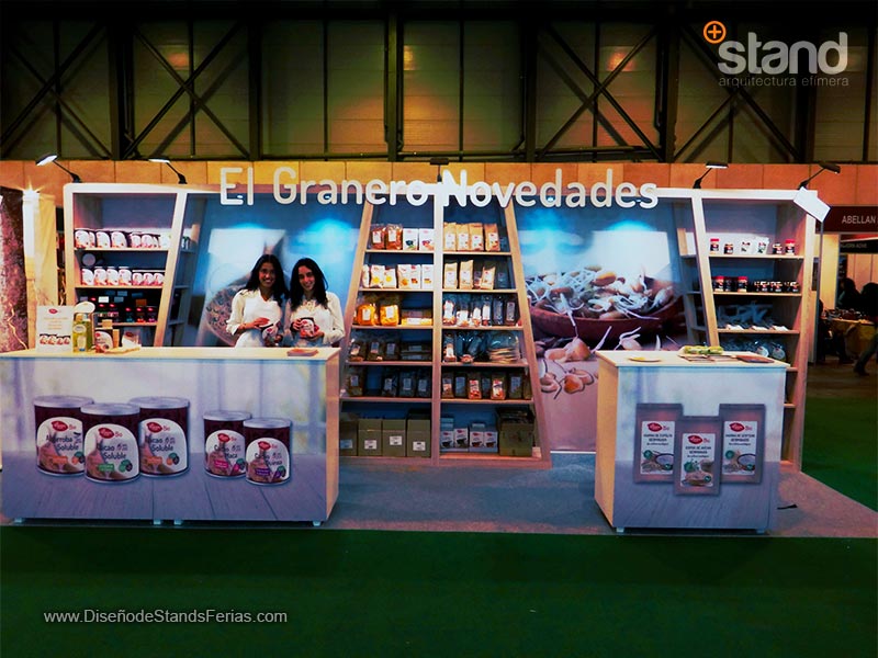 En DiseñoDeStandsFerias hemos llevado a cabo el diseño de las islas, gráficas, mostradores, etc. En concreto, el stand matriz de El Granero está diseñado en carpintería con temas naturales, transmitiendo de este modo la cercanía, calidad de producto y naturalidad que requería el evento.